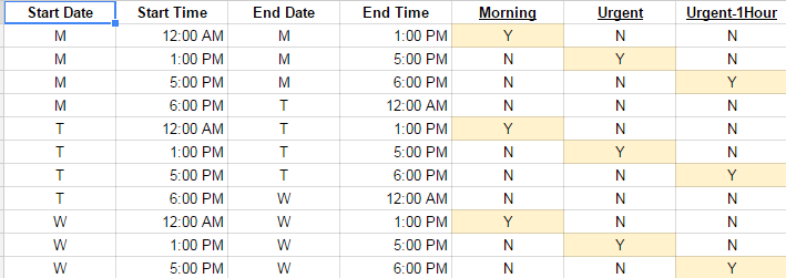 The first four columns are required, as they are specified. Be sure to use AM and PM for the time as well. The remaining columns are the labels applied to any add that you want to have running during that segment of time. It’s possible to have more than one Y in a column. Y means it’s active. N will be paused.